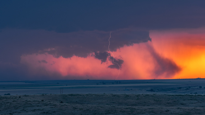 This LP Supercell had stunning Structure with Mammatus clouds and close proximity lightning. Taken near Mangum in Western Oklahoma with a brilliant orange sky caused by the sunset and the dust kicked up by the storms.