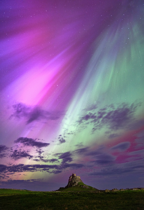 We traveled up to Northumberland for the dark sky and clearer weather in hopes of capturing the aurora. We weren't disappointed; it ended up being a Kp9 with a rating of G5, an extreme solar storm. I decided to see if the aurora could be seen over Lindisfarne Castle on Holy Island. We arrived early, but even with the light still visible in the sky from dusk, you could see the aurora right over our heads, stretching from east to west—quite remarkable. I ended up shooting southwest with Lindisfarne Castle in the frame, which is unheard of in the UK.