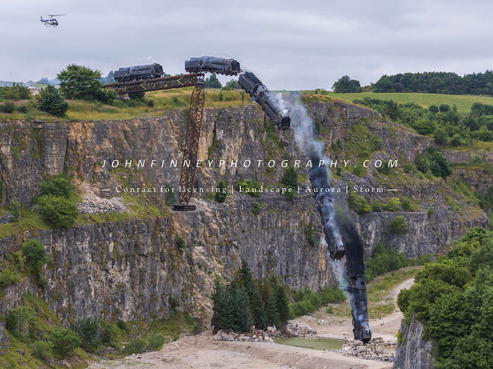 Mission: Impossible 7 locomotive crash scene in Derbyshire. The replica steam train is driven off the cliff for the final crash scene in Tom Crusie's latest blockbuster film. The locomotive flies through the air in spectacular style before crashing into the quarry below. The train was built specifically for the film & resembles a BR Britannia and has been named Le General Rive-Reine which relates to the 1964 war film 'The Train'.